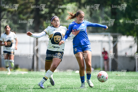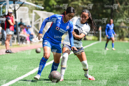 Ciudad de México, 18 de abril de 2026. Natalia Ugalde y Andrea Menendez, durante el partido correspondiente a la jornada 15 del torneo Clausura 2026 de la Liga BBVA Femenil categoría Sub19, entre las Pumas de la UNAM y la Máquina Celeste de Cruz Azul, realizado en Cantera. Foto: Imago7/ Alexis Chavez