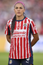 Zapopan, Jalisco, 4 de enero de 2026. Eva González, durante el partido correspondiente a la jornada 1 del torneo Clausura 2026 de la Liga BBVA MX Femenil, entre las Chivas Rayadas del Guadalajara y el Atlético San Luis, realizado en el estadio Akron. Foto: Imago7/ Juan Carlos Cubeyro.