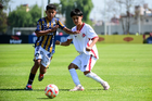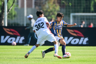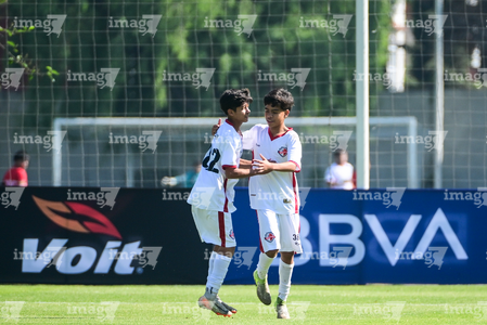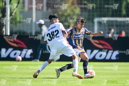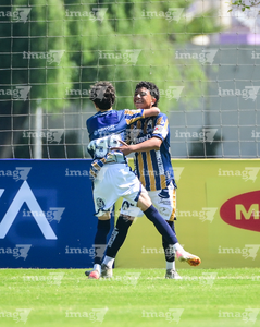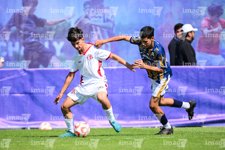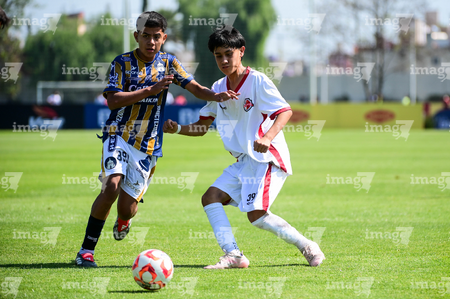 Toluca, Estado de México, 3 de abril de 2026. Matías Sánchez y Victor Escutia, durante el partido correspondiente a la jornada 1 del torneo 2026 de la Liga BBVA MX categoría Sub14, entre el Atlético San Luis y el Caja Oblatos CFD, realizado en las instalaciones de la Federación Mexicana de Futbol. Foto: Imago7/ Alexis Chavez