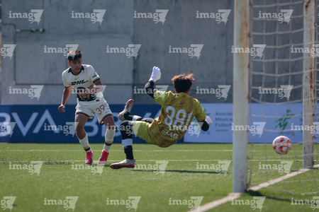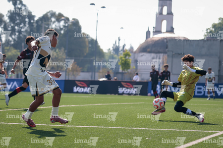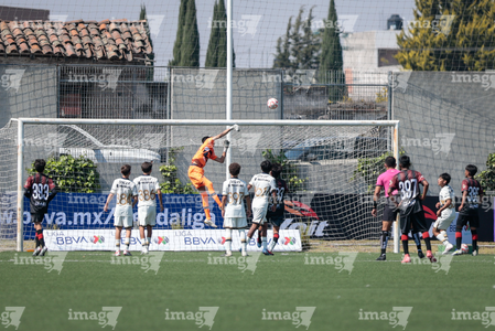 Toluca, Estado de México, 3 de abril de 2026. Atajada de Santiago Venegas, durante el partido correspondiente a la jornada 1 del torneo 2026 de la Liga BBVA MX categoría Sub14, entre los Pumas de la UNAM y Talentos AMFPRO, , realizado en las instalaciones de la Federación Mexicana de Futbol. Foto: Imago7/Daniel Arriaga