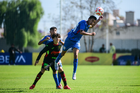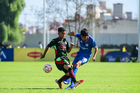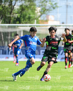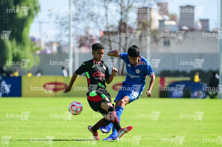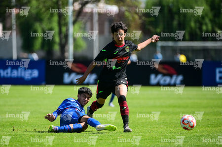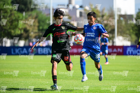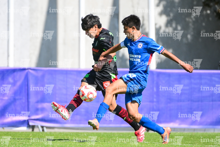 Toluca, Estado de México, 4 de abril de 2026. Nicolás Muñoz y Vladimir Anzures, durante el partido correspondiente a la jornada 2 del torneo 2026 de la Liga BBVA MX categoría Sub14, entre la Máquina Celeste del Cruz Azul y los Bravos de FC Juárez, realizado en las instalaciones de la Federación Mexicana de Futbol. Foto: Imago7/ Alexis Chavez