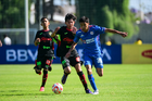 Toluca, Estado de México, 4 de abril de 2026. Ethan Esparza y Manuel Flores, durante el partido correspondiente a la jornada 2 del torneo 2026 de la Liga BBVA MX categoría Sub14, entre la Máquina Celeste del Cruz Azul y los Bravos de FC Juárez, realizado en las instalaciones de la Federación Mexicana de Futbol. Foto: Imago7/ Alexis Chavez