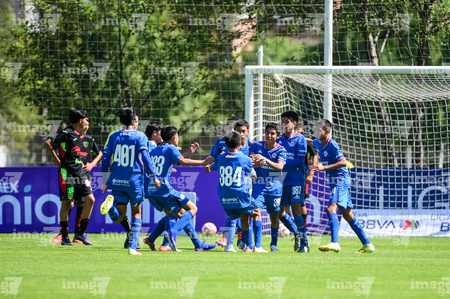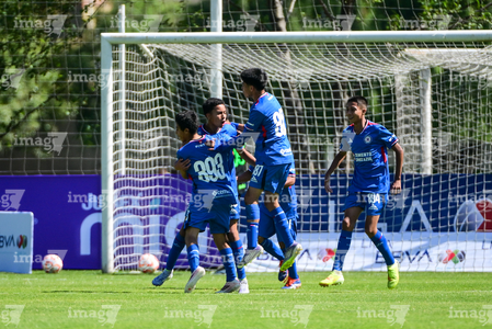 Toluca, Estado de México, 4 de abril de 2026. Jugadores de Cruz Azul en festejo de gol, durante el partido correspondiente a la jornada 2 del torneo 2026 de la Liga BBVA MX categoría Sub14, entre la Máquina Celeste del Cruz Azul y los Bravos de FC Juárez, realizado en las instalaciones de la Federación Mexicana de Futbol. Foto: Imago7/ Alexis Chavez