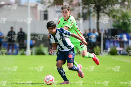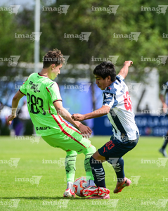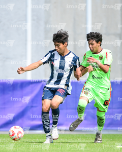 Toluca, Estado de México, 7 de abril de 2026. Matteo Leija y Gael Valenzuela, durante el partido correspondiente a los Octavos de Final del torneo 2026 de la Liga BBVA MX categoría Sub14, entre los Rayados del Monterrey y los Bravos de FC Juárez, realizado en las instalaciones de la Federación Mexicana de Futbol. Foto: Imago7/ Alexis Chavez