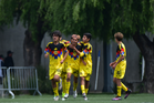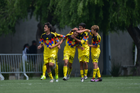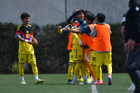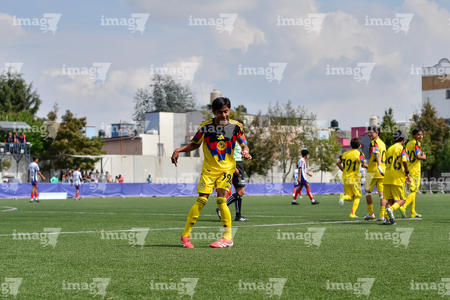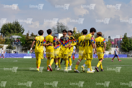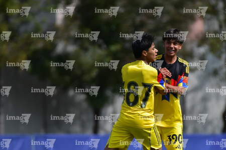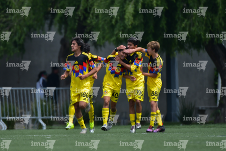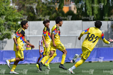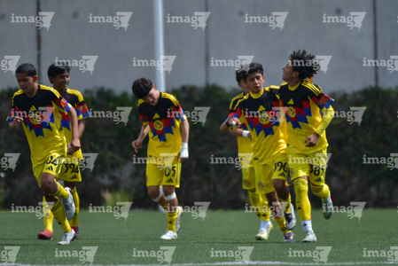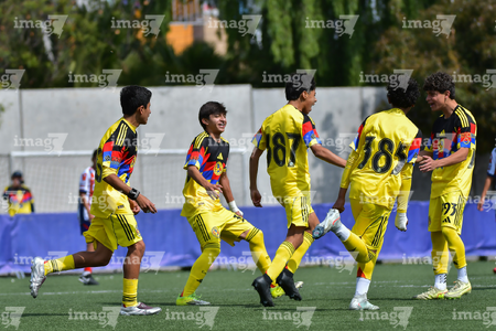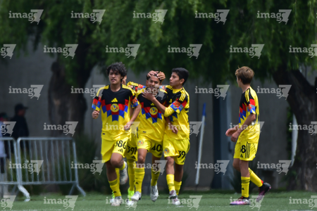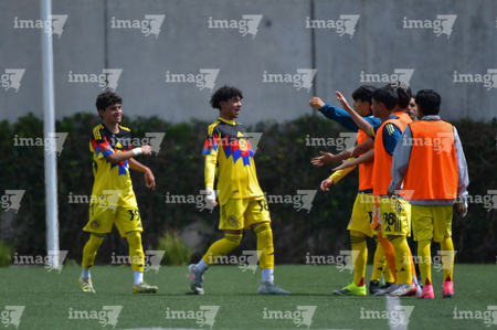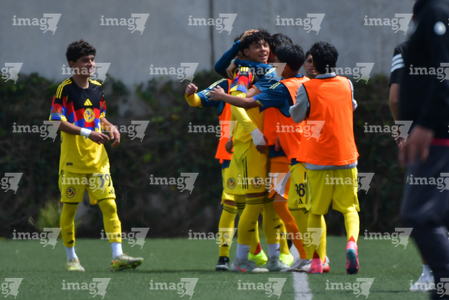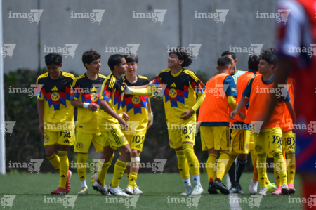 Toluca, Estado de México, 7 de abril de 2026. Jugadores del América sub14 en festejo de gol, durante el partido correspondiente a los Octavos de Final del torneo 2026 de la Liga BBVA MX categoría Sub14, entre las Águilas del América y el Atlético San Luis, realizado en las instalaciones de la Federación Mexicana de Futbol. Foto: Imago7/ Arturo Hernández