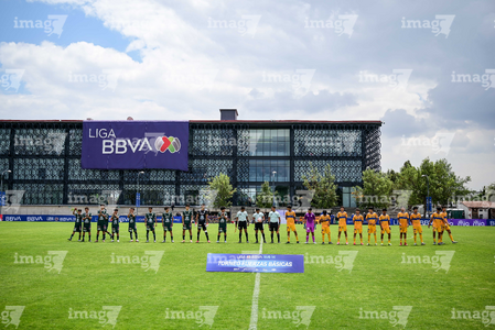 Toluca, Estado de México, 7 de abril de 2026. Jugadores en minuto de silencio, durante el partido correspondiente a los Octavos de Final del torneo 2026 de la Liga BBVA MX categoría Sub14, entre los Esmeraldas del León y los Tigres de la UANL, realizado en las instalaciones de la Federación Mexicana de Futbol. Foto: Imago7/ Alexis Chavez