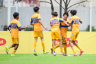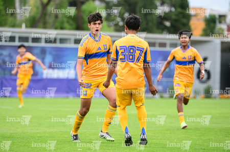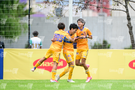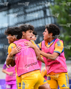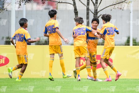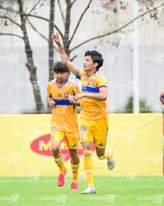Toluca, Estado de México, 7 de abril de 2026. Jugadores de Tigres en festejo de gol, durante el partido correspondiente a los Octavos de Final del torneo 2026 de la Liga BBVA MX categoría Sub14, entre los Esmeraldas del León y los Tigres de la UANL, realizado en las instalaciones de la Federación Mexicana de Futbol. Foto: Imago7/ Alexis Chavez