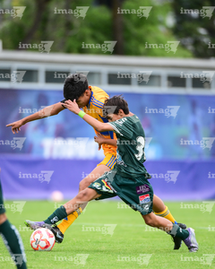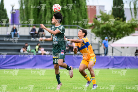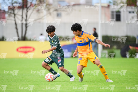 Toluca, Estado de México, 7 de abril de 2026. Tadeo Núñez y Rolan López, durante el partido correspondiente a los Octavos de Final del torneo 2026 de la Liga BBVA MX categoría Sub14, entre los Esmeraldas del León y los Tigres de la UANL, realizado en las instalaciones de la Federación Mexicana de Futbol. Foto: Imago7/ Alexis Chavez
