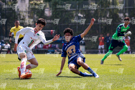 Toluca, Estado de México, 8 de abril de 2026. Mateo Huerta y Santiago Venegas, durante el partido correspondiente a los Cuartos de Final del torneo 2026 de la Liga BBVA MX categoría Sub14, entre los Pumas de la UNAM y las Chivas Rayadas del Guadalajara, realizado en las instalaciones de la Federación Mexicana de Futbol. Foto: Imago7/Daniel Arriaga