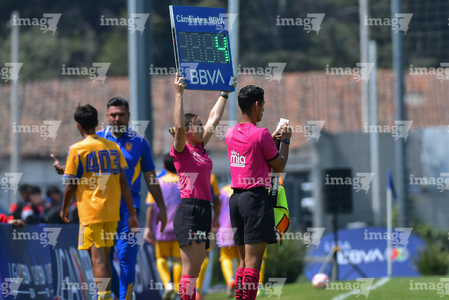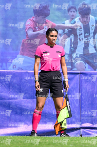 Toluca, Estado de México, 8 de abril de 2026. Estéfany Sarahí Gómez Guizar, árbitra asistente, durante el partido correspondiente a los Cuartos de Final del torneo 2026 de la Liga BBVA MX categoría Sub14, entre los Rayados del Monterrey y los Tigres de la UANL, realizado en las instalaciones de la Federación Mexicana de Futbol. Foto: Imago7/ Alexis Chavez