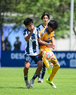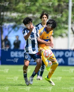Toluca, Estado de México, 8 de abril de 2026. César Tovar y Victor Avila, durante el partido correspondiente a los Cuartos de Final del torneo 2026 de la Liga BBVA MX categoría Sub14, entre los Rayados del Monterrey y los Tigres de la UANL, realizado en las instalaciones de la Federación Mexicana de Futbol. Foto: Imago7/ Alexis Chavez