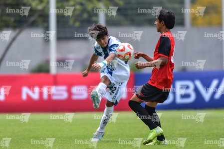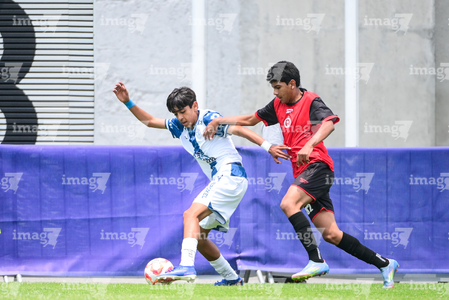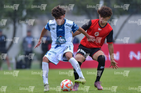 Toluca, Estado de México, 8 de abril de 2026. Santiago Téllez y Gustavo Burgueño , durante el partido correspondiente a los Cuartos de Final del torneo 2026 de la Liga BBVA MX categoría Sub14, entre los Tuzos del Pachuca y los Xolos de Tijuana, realizado en las instalaciones de la Federación Mexicana de Futbol. Foto: Imago7/ Arturo Hernandez