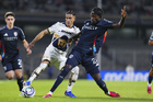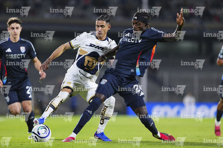 Ciudad de México, 10 de febrero de 2026. Uriel Antuna y Manu Duah, durante el partido de vuelta de la primera ronda de la Champions Cup de la CONCACAF 2026, entre los Pumas de la UNAM y el San Diego FC, realizado en el estadio Olímpico Universitario. Foto: Imago7/ Manlio Contreras