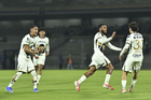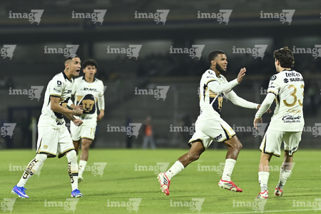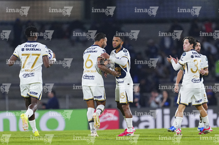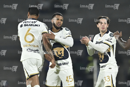 Ciudad de México, 10 de febrero de 2026. Uriel Antuna, Pedro Vite y Jordan Carrillo en festejo de gol, durante el partido de vuelta de la primera ronda de la Champions Cup de la CONCACAF 2026, entre los Pumas de la UNAM y el San Diego FC, realizado en el estadio Olímpico Universitario. Foto: Imago7/Etzel Espinosa