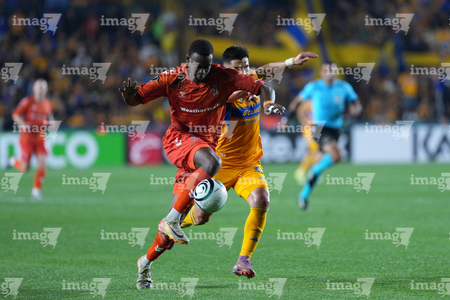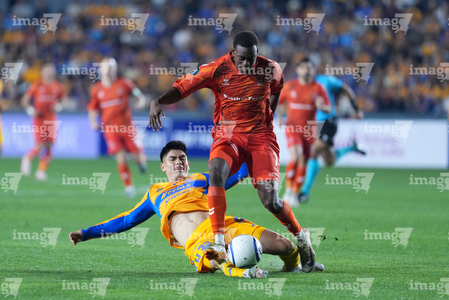San Nicolás de los Garza, 10 de febrero de 2026. Ismael Oketokoun y Vladimir Loroña, durante el partido de vuelta de la primera ronda de la Champions Cup de la CONCACAF 2026, entre los Tigres de la UANL y el Forge FC, realizado en el estadio Universitario. Foto: Imago7/ Andrea Jiménez
