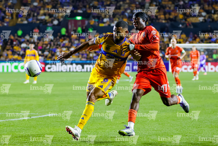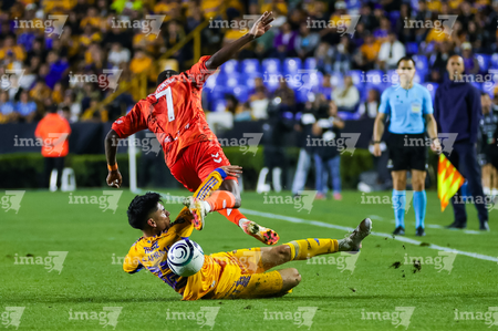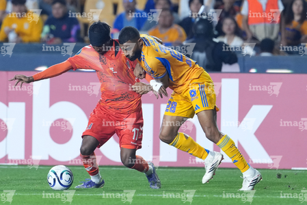 San Nicolás de los Garza, 10 de febrero de 2026. Jesús Angulo (D), durante el partido de vuelta de la primera ronda de la Champions Cup de la CONCACAF 2026, entre los Tigres de la UANL y el Forge FC, realizado en el estadio Universitario. Foto: Imago7/ Andrea Jiménez