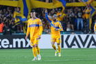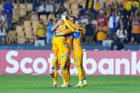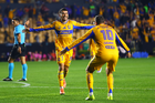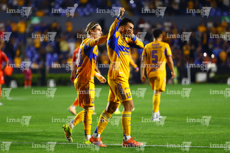 San Nicolás de los Garza, 10 de febrero de 2026. Rodrigo Aguirre y Diego Lainez en festejo de gol, durante el partido de vuelta de la primera ronda de la Champions Cup de la CONCACAF 2026, entre los Tigres de la UANL y el Forge FC, realizado en el estadio Universitario. Foto: Imago7/ Andrea Jiménez