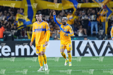 San Nicolás de los Garza, 10 de febrero de 2026. Juan Brunetta y Rodrigo Aguirre en festejo de gol, durante el partido de vuelta de la primera ronda de la Champions Cup de la CONCACAF 2026, entre los Tigres de la UANL y el Forge FC, realizado en el estadio Universitario. Foto: Imago7/ Andrea Jiménez
