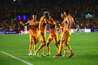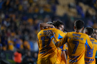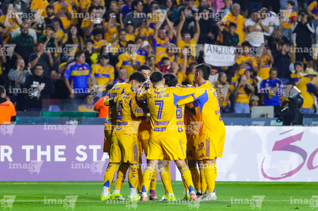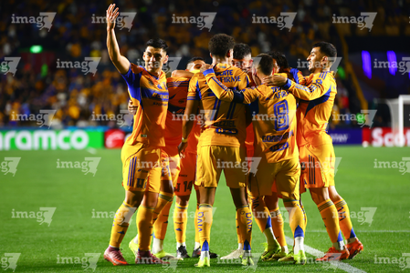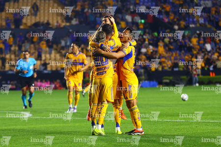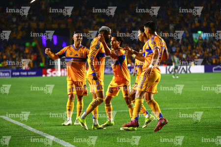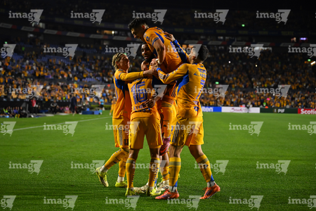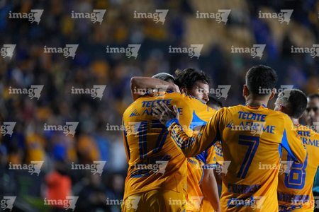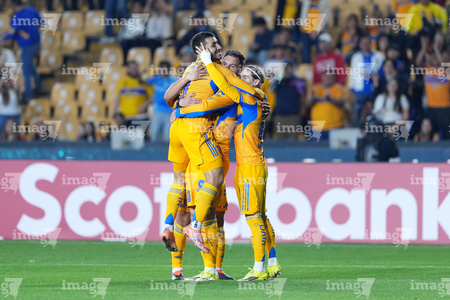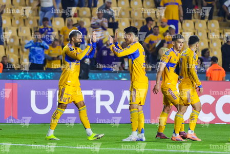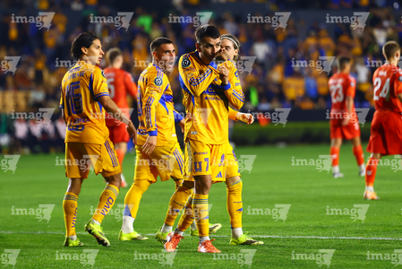 San Nicolás de los Garza, 10 de febrero de 2026. Jugadores de Tigres en festejo de gol, durante el partido de vuelta de la primera ronda de la Champions Cup de la CONCACAF 2026, entre los Tigres de la UANL y el Forge FC, realizado en el estadio Universitario. Foto: Imago7/ Andrea Jiménez