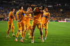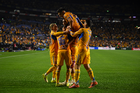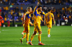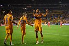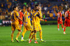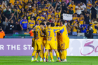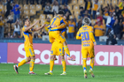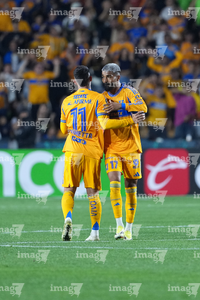 San Nicolás de los Garza, 10 de febrero de 2026. Ángel Correa, André-Pierre Gignac y Marcelo Flores en festejo de gol, durante el partido de vuelta de la primera ronda de la Champions Cup de la CONCACAF 2026, entre los Tigres de la UANL y el Forge FC, realizado en el estadio Universitario. Foto: Imago7/ Andrea Jiménez