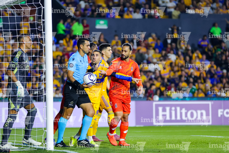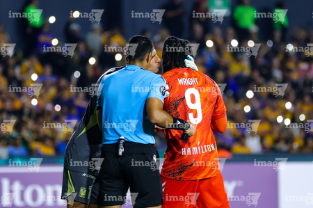 San Nicolás de los Garza, 10 de febrero de 2026. Nahuel Guzmán y Brian Wright, durante el partido de vuelta de la primera ronda de la Champions Cup de la CONCACAF 2026, entre los Tigres de la UANL y el Forge FC, realizado en el estadio Universitario. Foto: Imago7/ Nora Pamela