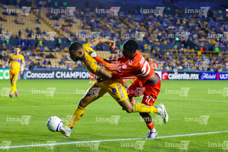 San Nicolás de los Garza, 10 de febrero de 2026. Joaquim Pereira y Hoce Massunda, durante el partido de vuelta de la primera ronda de la Champions Cup de la CONCACAF 2026, entre los Tigres de la UANL y el Forge FC, realizado en el estadio Universitario. Foto: Imago7/ Nora Pamela