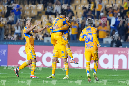 San Nicolás de los Garza, 10 de febrero de 2026. Jugadores de Tigres en festejo de gol, durante el partido de vuelta de la primera ronda de la Champions Cup de la CONCACAF 2026, entre los Tigres de la UANL y el Forge FC, realizado en el estadio Universitario. Foto: Imago7/ David Arzamendi