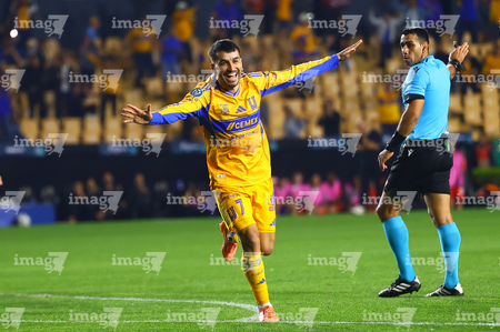 San Nicolás de los Garza, 10 de febrero de 2026. Rodrigo Aguirre en festejo de gol, durante el partido de vuelta de la primera ronda de la Champions Cup de la CONCACAF 2026, entre los Tigres de la UANL y el Forge FC, realizado en el estadio Universitario. Foto: Imago7/ David Arzamendi