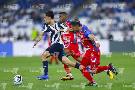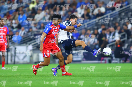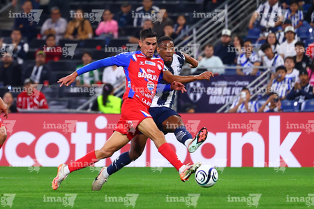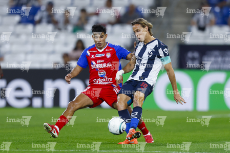 Guadalupe, Nuevo León, 11 de febrero de 2026. José Longo y Uros Durdevic, durante el partido de vuelta de la primera ronda de la Champions Cup de la CONCACAF 2026, entre los Rayados del Monterrey y el Xelajú MC, realizado en el estadio BBVA. Foto: Imago7/ Nora Pamela
