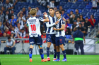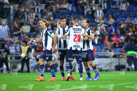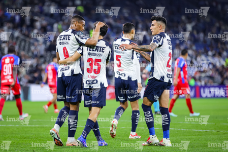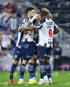 Guadalupe, Nuevo León, 11 de febrero de 2026. Jugadores de Monterrey en festejo de gol, durante el partido de vuelta de la primera ronda de la Champions Cup de la CONCACAF 2026, entre los Rayados del Monterrey y el Xelajú MC, realizado en el estadio BBVA. Foto: Imago7/David Arzamendi