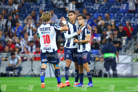 Guadalupe, Nuevo León, 11 de febrero de 2026. Sergio Canales, Fidel Ambríz e Iker Fimbres en festejo de gol, durante el partido de vuelta de la primera ronda de la Champions Cup de la CONCACAF 2026, entre los Rayados del Monterrey y el Xelajú MC, realizado en el estadio BBVA. Foto: Imago7/David Arzamendi