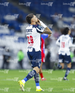 Guadalupe, Nuevo León, 11 de febrero de 2026. Lucas Ocampos en lamento, durante el partido de vuelta de la primera ronda de la Champions Cup de la CONCACAF 2026, entre los Rayados del Monterrey y el Xelajú MC, realizado en el estadio BBVA. Foto: Imago7/David Arzamendi