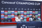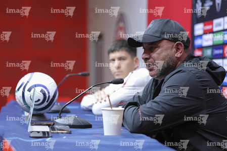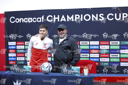 Toluca, Estado de México, 7 de abril de 2026. Franco Romero y Antonio Mohamed, durante una conferencia de prensa previo a la ida de los Cuartos de Final de la Champions Cup 2026 de la CONCACAF, entre los Diablos Rojos del Toluca y el LA Galaxy, realizada en el estadio Nemesio Diez. Foto: Imago7/ Rafael Vadillo