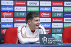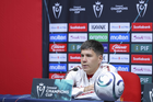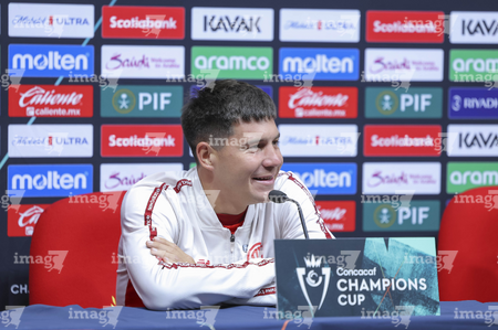 Toluca, Estado de México, 7 de abril de 2026. Franco Romero, durante una conferencia de prensa previo a la ida de los Cuartos de Final de la Champions Cup 2026 de la CONCACAF, entre los Diablos Rojos del Toluca y el LA Galaxy, realizada en el estadio Nemesio Diez. Foto: Imago7/ Rafael Vadillo