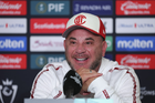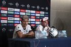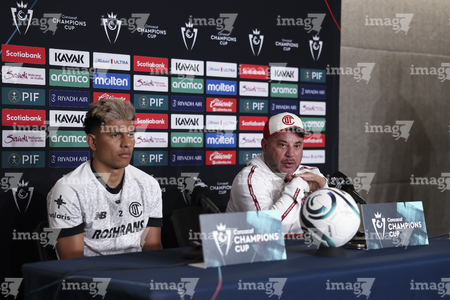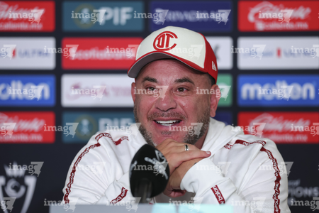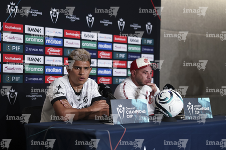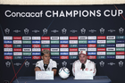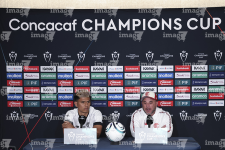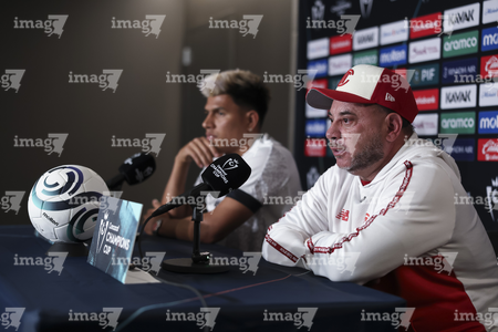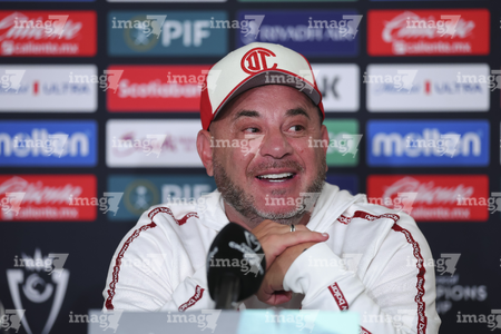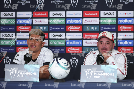 Los Angeles, California, Estados Unidos, 28 de abril de 2026. Jesús Gallardo y Antonio Mohamed, durante una conferencia de prensa previo a la ida de las Semifinales de la Champions Cup 2026 de la CONCACAF, entre el LAFC y los Diablos Rojos del Toluca, realizada en el BMO Stadium. Foto: Imago7/ Rafael Vadillo