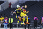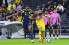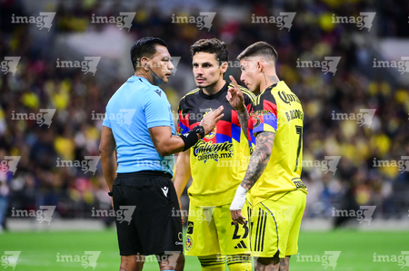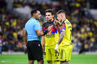 Ciudad de México, 14 de abril de 2026. Raphael Veiga y Brian Rodríguez en reclamo, durante el partido de vuelta de los Cuartos de Final de la Champions Cup de la CONCACAF 2026, entre las Águilas del América y el Nashville SC, realizado en el estadio Ciudad de los Deportes. Foto: Imago7/ Alexis Chavez