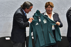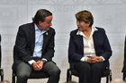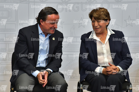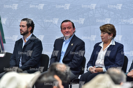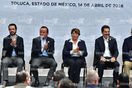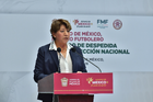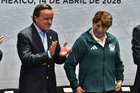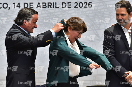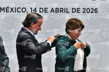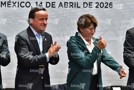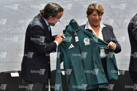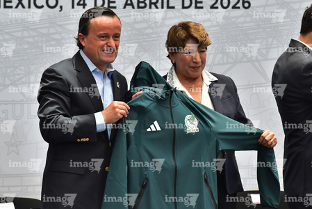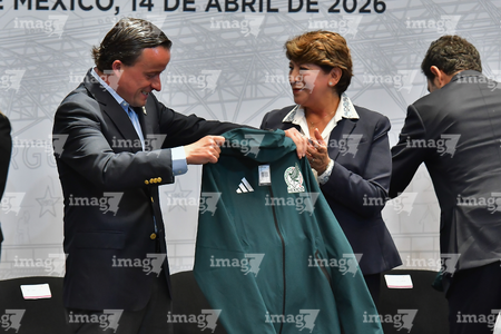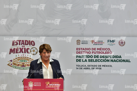 Toluca, Estado de México, 14 de abril de 2026. Mikel Arriola, Comisionado de la FMF y Delfina Gomez, Gobernadora del Estado de México, durante una conferencia de prensa para anunciar un partido internacional de preparación entre la Selección Nacional de México y la Selección de Serbia a disputarse en el estadio Nemesio Diez, realizada en el Palacio de Gobierno de Toluca. Foto: Imago7/ Arturo Hernández