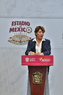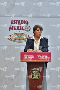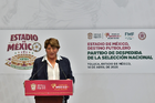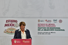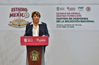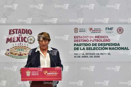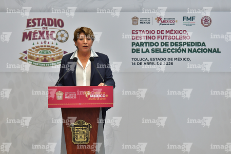 Toluca, Estado de México, 14 de abril de 2026. Delfina Gomez, Gobernadora el Estado de México, durante una conferencia de prensa para anunciar un partido internacional de preparación entre la Selección Nacional de México y la Selección de Serbia a disputarse en el estadio Nemesio Diez, realizada en el Palacio de Gobierno de Toluca. Foto: Imago7/ Arturo Hernández