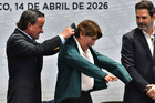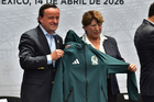 Toluca, Estado de México, 14 de abril de 2026. Mikel Arriola, Comisionado de la FMF y Delfinal Gomez, Gobernadora del Estado de México, durante una conferencia de prensa para anunciar un partido internacional de preparación entre la Selección Nacional de México y la Selección de Serbia a disputarse en el estadio Nemesio Diez, realizada en el Palacio de Gobierno de Toluca. Foto: Imago7/ Arturo Hernández