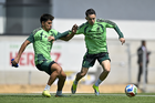 Ciudad de México, 25 de marzo de 2026. Jesús Gallardo y Álvaro Fidalgo, durante el entrenamiento de la selección nacional de México en las instalaciones del CAR, previo al partido de preparación frente a la selección de Portugal Foto: Imago7/ Etzel Espinosa